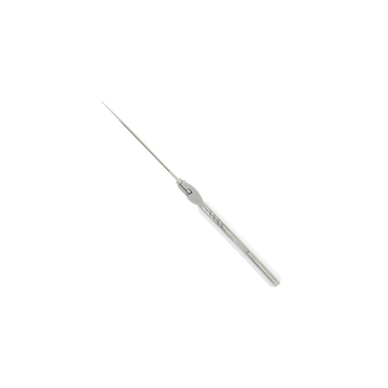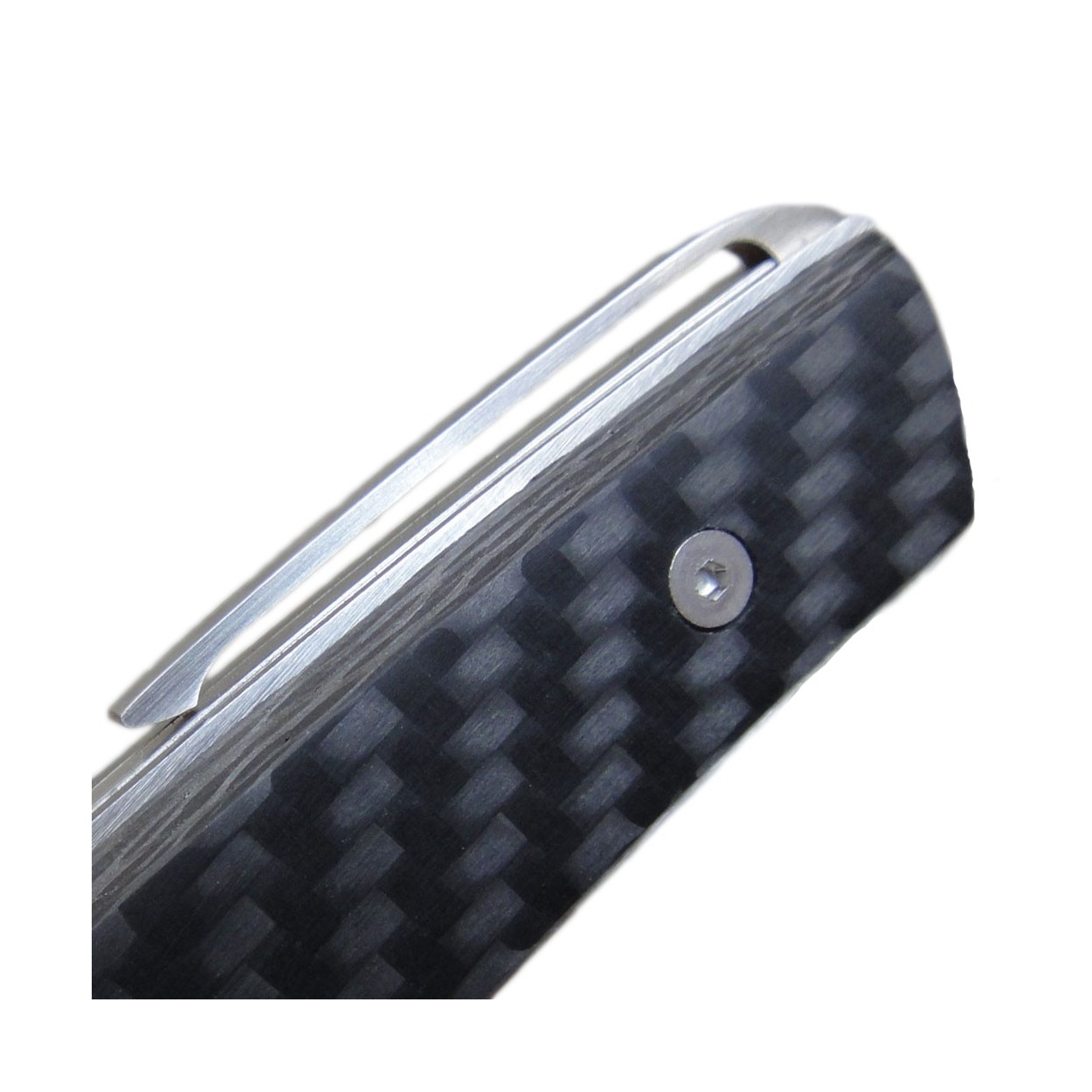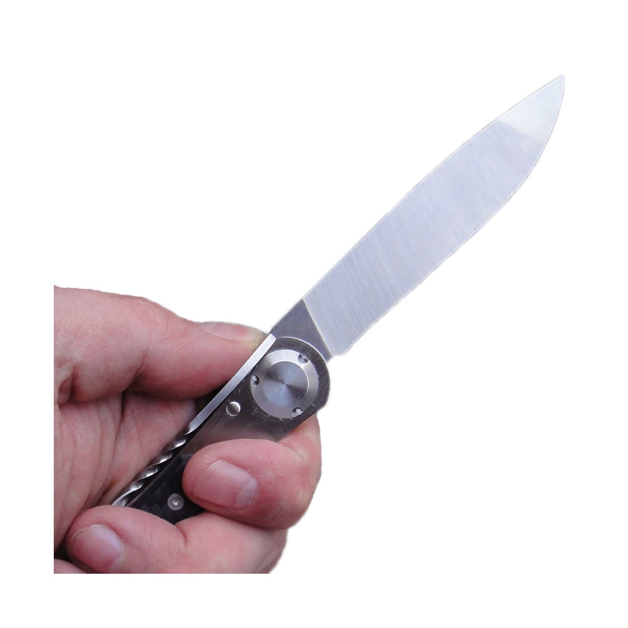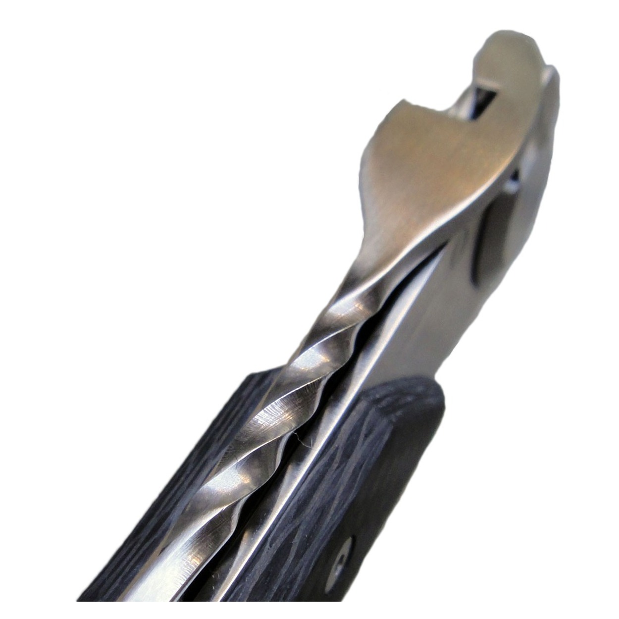 - L'acier de lame : Il est issu des dernières avancées métallurgiques avec une nuance dopée à l'azote à la désignation : AISI 4116N (ou X50CrMoV15N). L'azote augmente la dureté à la trempe tout en favorisant la facilité d'affûtage. La trempe cryogénique permet d'atteindre 58 à 60 HRC. La lame est forgée (la poche longitudinale sur le dos de la lame, qui reste brute de forge, est la garantie de ce procédé de fabrication)